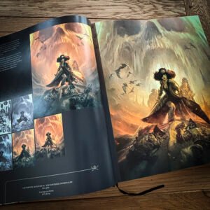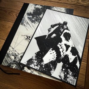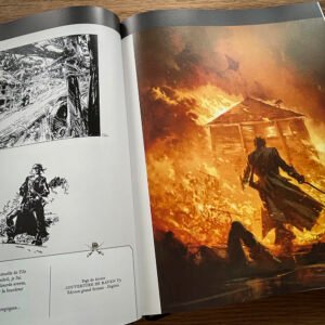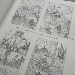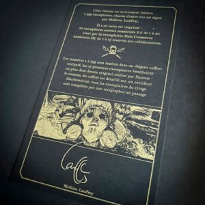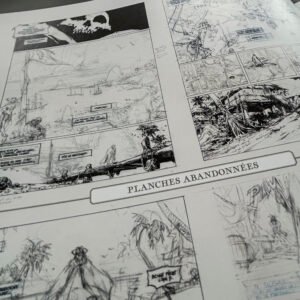 – L'intégralité de l'album en reproduction de planches originales, tous les détails de conception sont visibles, le tome 3 est également présenté dans sa version crayonnée, – 74 pages de cahier graphique couleur reprenant des visuels inédits, des recherches, des illustrations, des versions abandonnées et une interview ! – Un tiré à part format 24 x 32 cm en sérigraphie 1 couleur signé par l'auteur, – embossage et débossage sur la couverture avant et arrière afin de donner des effets de matière et de relief, – Les pages de gardes avant et arrière imprimées sur un beau papier Fedrigoni noir teinté dans la masse.